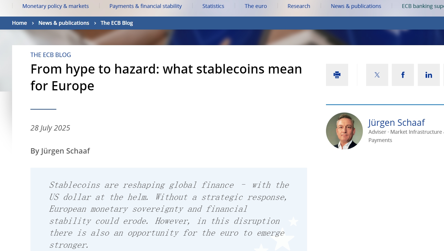 欧洲央行警告:稳定币的崛起可能会削弱欧元区货币政策主导权