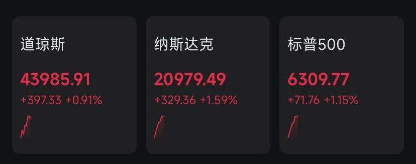 当地时间周一,美股三大指数集体高开,道指开盘涨0.37%,纳指涨0.99%,标普500指数涨0.62%。随后指数涨幅进一步扩大,截至发稿时,标普500指数涨1.15%,纳斯达克指数上涨约1.6%。