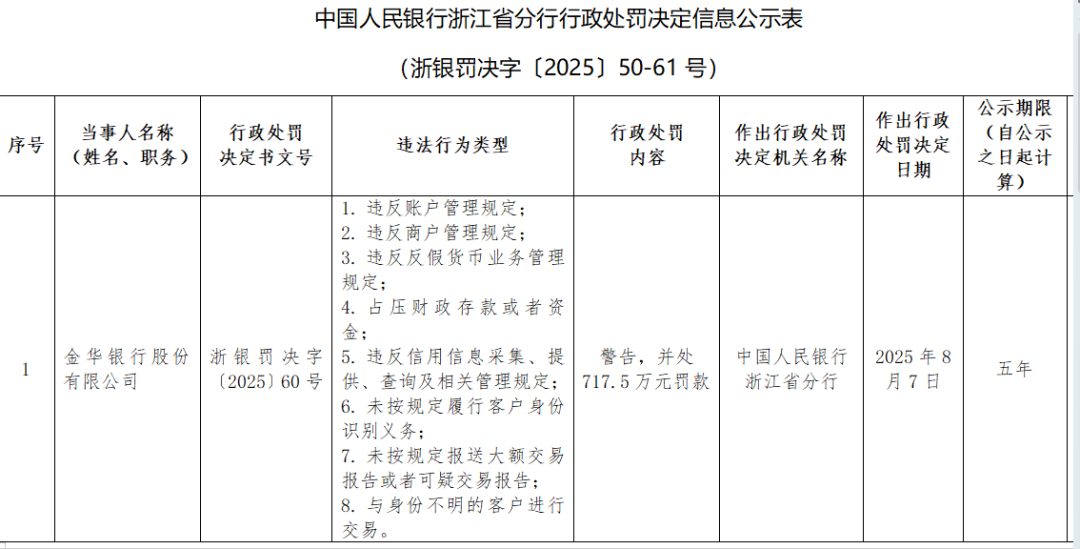 近日,中国人民银行浙江省分行对金华银行开具高达717.5万元的罚单,剑指多项业务违规,同时对该行11名涉事责任人连带处罚,处罚金额也创下该行成立以来的最高处罚纪录!