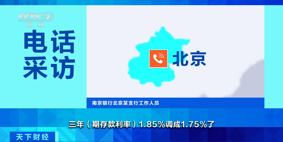江苏银行北京某支行工作人员:三年期存款利率1.75%,之前三年期存款利率是1.85%,是上周三降的。