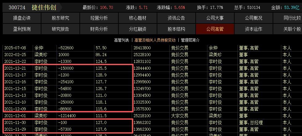 《每日经济新闻》记者还注意到,其实这并非李时俊首次实施减持计划——东方财富Choice数据显示,光是在2021年11月29日—12月22日,也就是李时俊还担任公司总经理期间,他就在不到一个月的时间内减持了88.85万股,按照当时的交易均价来计算,李时俊在担任总经理的最后几个月就套现了近1.1亿元。