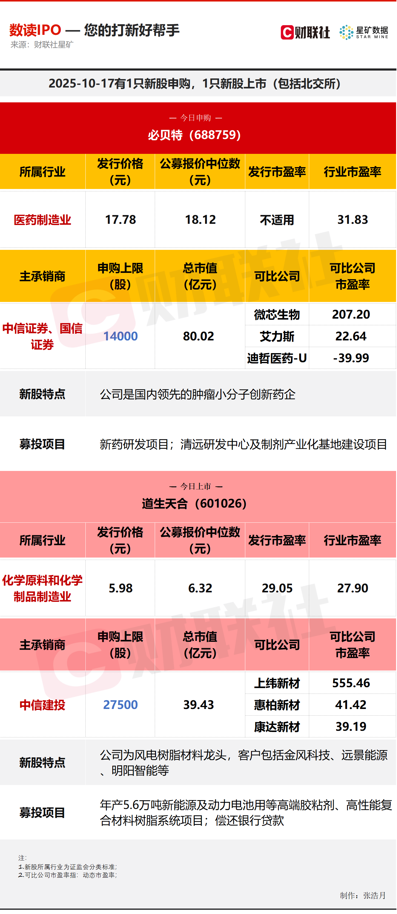 财联社10月17日讯,今日有1只新股申购,为科创板的必贝特;1只新股上市,为沪市主板的道生天合。