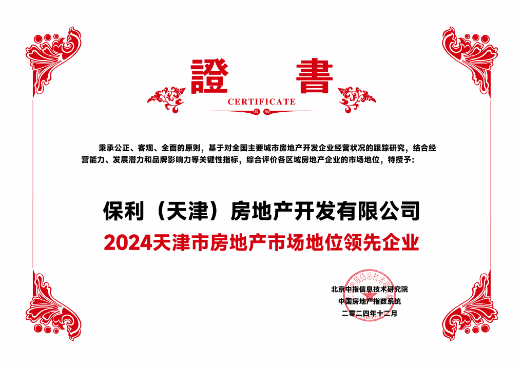 根据研究结果显示,保利天津用央企的责任心和城市担当见证着城市荣光,获得了业内外的一致好评,成为天津房地产市场健康发展的领军企业,荣膺“2024 天津市房地产市场地位领先企业”。