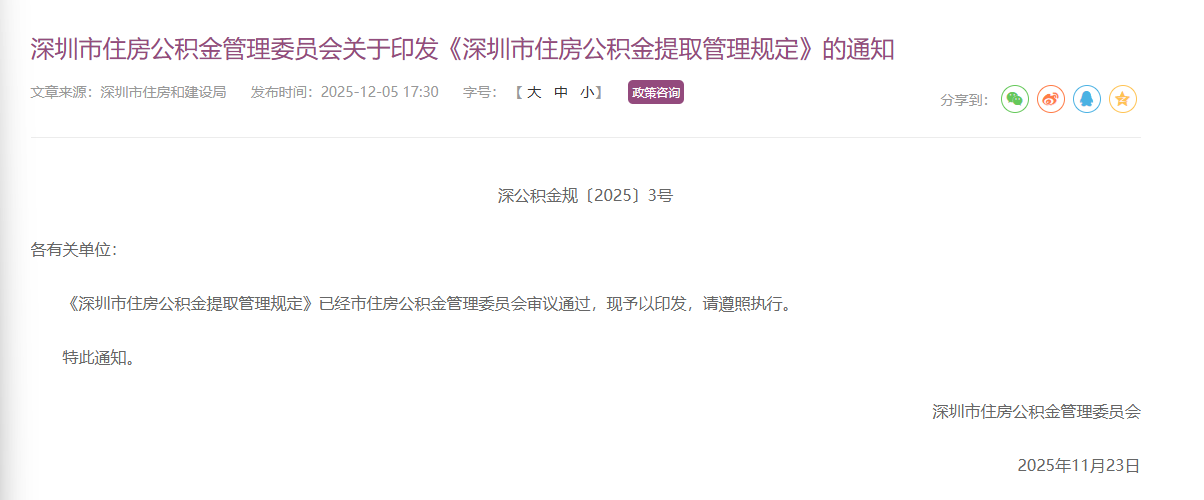上证报中国证券网讯(记者杨子晏)12月5日,深圳市住房公积金管理委员会发布新版《深圳市住房公积金提取管理规定》(以下简称“提取新规”),在支持职工购房、租房等方面推出系列便民举措。提取新规将于2025年12月15日起施行。