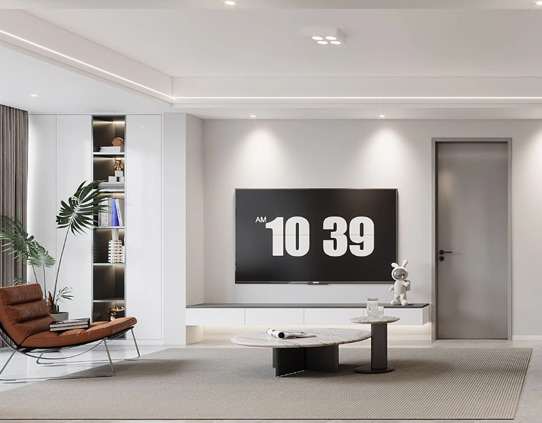 空间布局合理。电视墙简约大气,搭配悬浮式地柜,增添轻盈感。一侧嵌入式开放书架,丰富收纳与展示功能。棕色单椅为空间注入活力,与浅灰地毯、大理石茶几搭配,营造出舒适且具现代感的休闲氛围,整体彰显简约而不失格调的设计风格