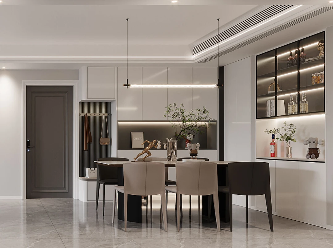 整体简约雅致。以灰白为主色调,搭配木色地板,温馨舒适。中间黑色茶桌搭配白色座椅与圆凳,点缀金色元素,精致有格调。靠墙设满墙收纳柜,中部开放式格架配灯带,可陈列茶具与书籍。窗边纱帘与窗帘组合,引入自然光线,营造出静谧的品茶氛围