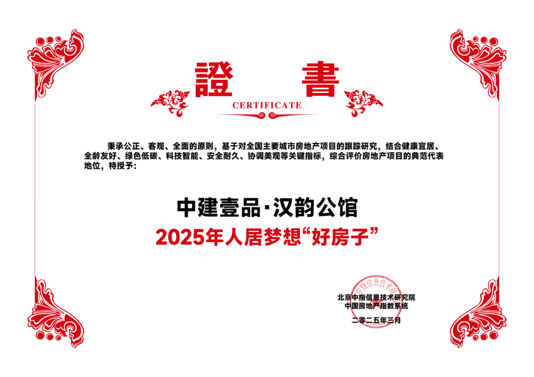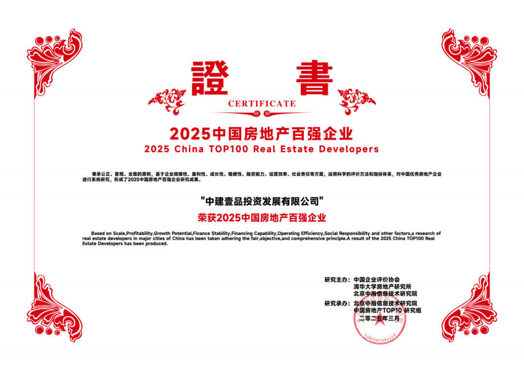 中建壹品凭借稳健的经营业绩、雄厚的综合实力,再度荣膺“2025中国房地产百强企业”,获得业内认可。