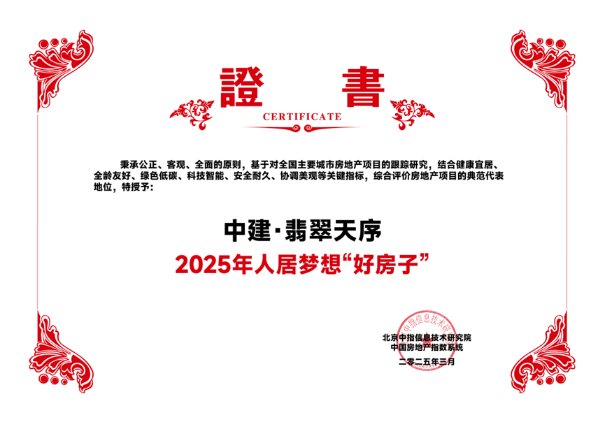中建·翡翠天序项目凭借卓越品质荣获2025年人居梦想“好房子”证书,成为备受瞩目的焦点。