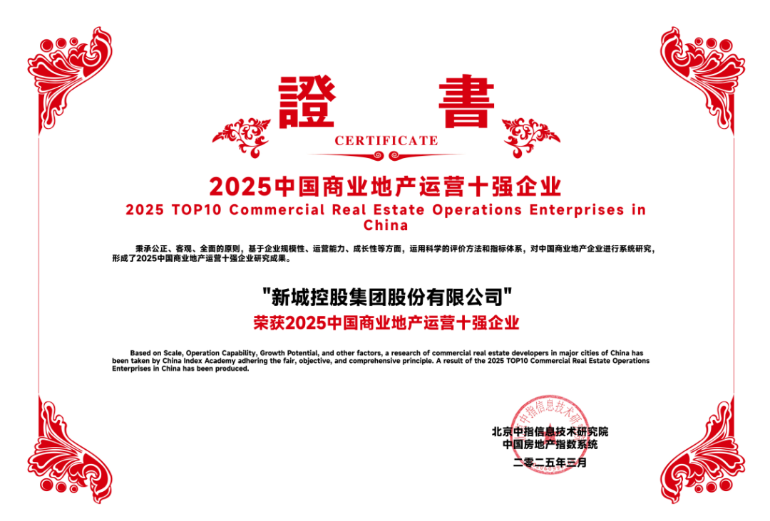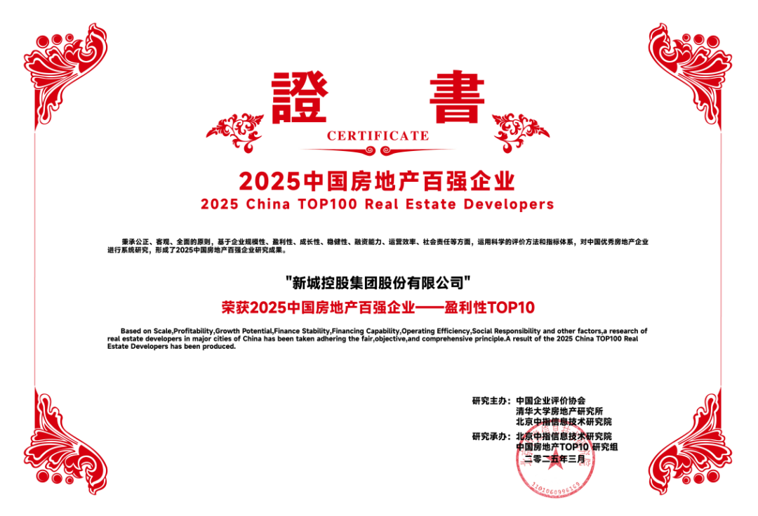 2025年3月20日,由中国企业评价协会、清华大学房地产研究所、北京中指信息技术研究院主办,北京中指信息技术研究院中国房地产TOP10研究组承办的“2025中国房地产百强企业研究成果发布会暨第二十二届中国房地产百强企业家论坛”在北京召开。大会发布了2025中国房地产百强企业名单,新城控股集团荣膺“2025中国房地产百强企业-综合实力TOP10” 、“2025中国房地产百强企业-融资能力TOP10”、“2025中国房地产百强企业-盈利性TOP10”、“2025中国商业地产百强企业”、“2025中国商业地产运营十强企业”等重量级荣誉。