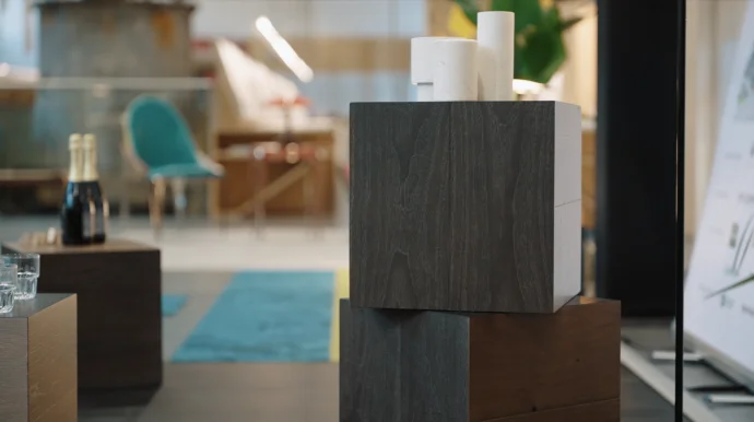 除此以外,【回溯】系列其他产品创新以原木立方的装置形态登上展位,不同表面色彩工艺的地板面拼合成六面体,其六个面也象征了居住空间的六面性,寓意未来空间的更多可能性。