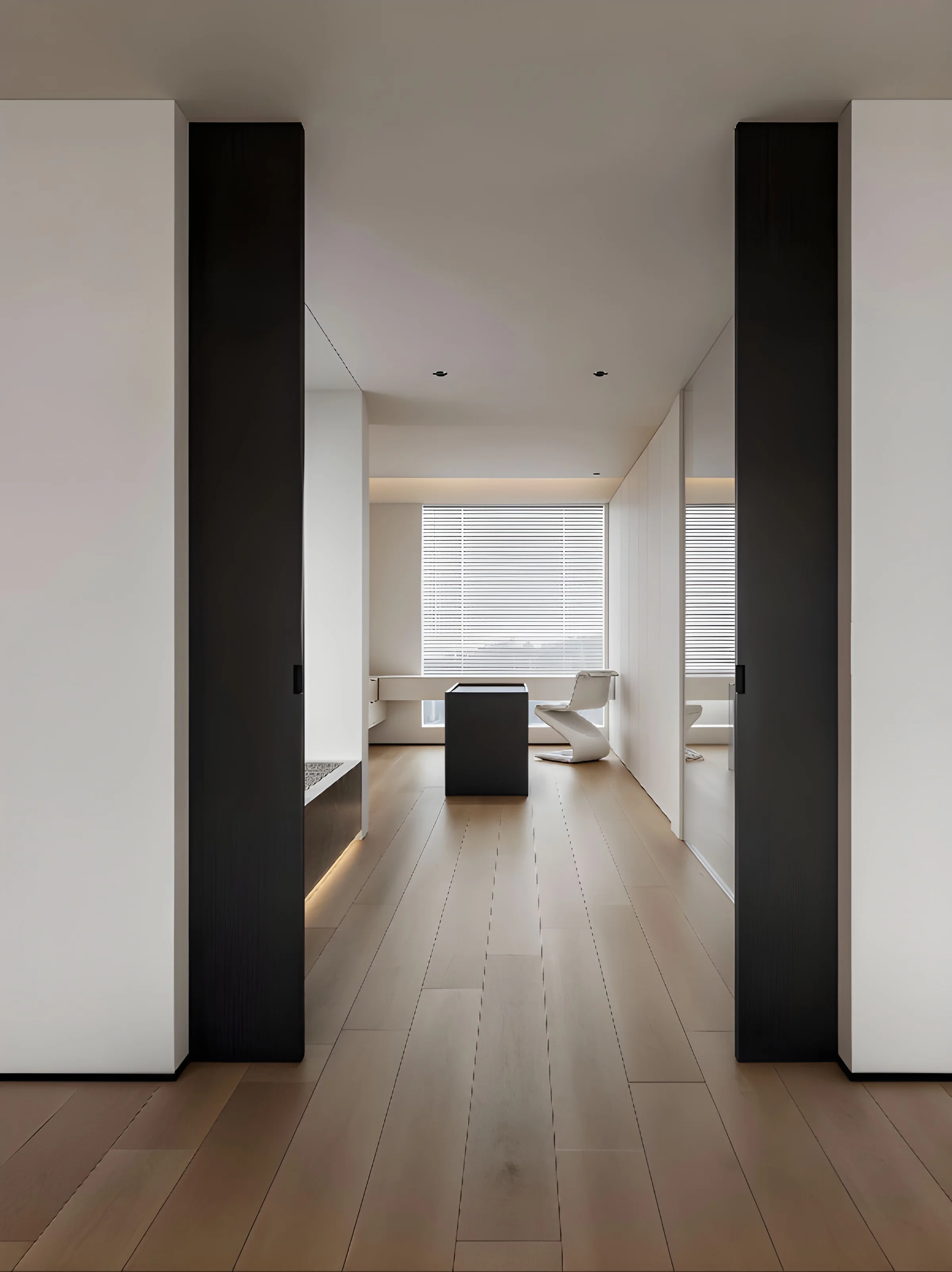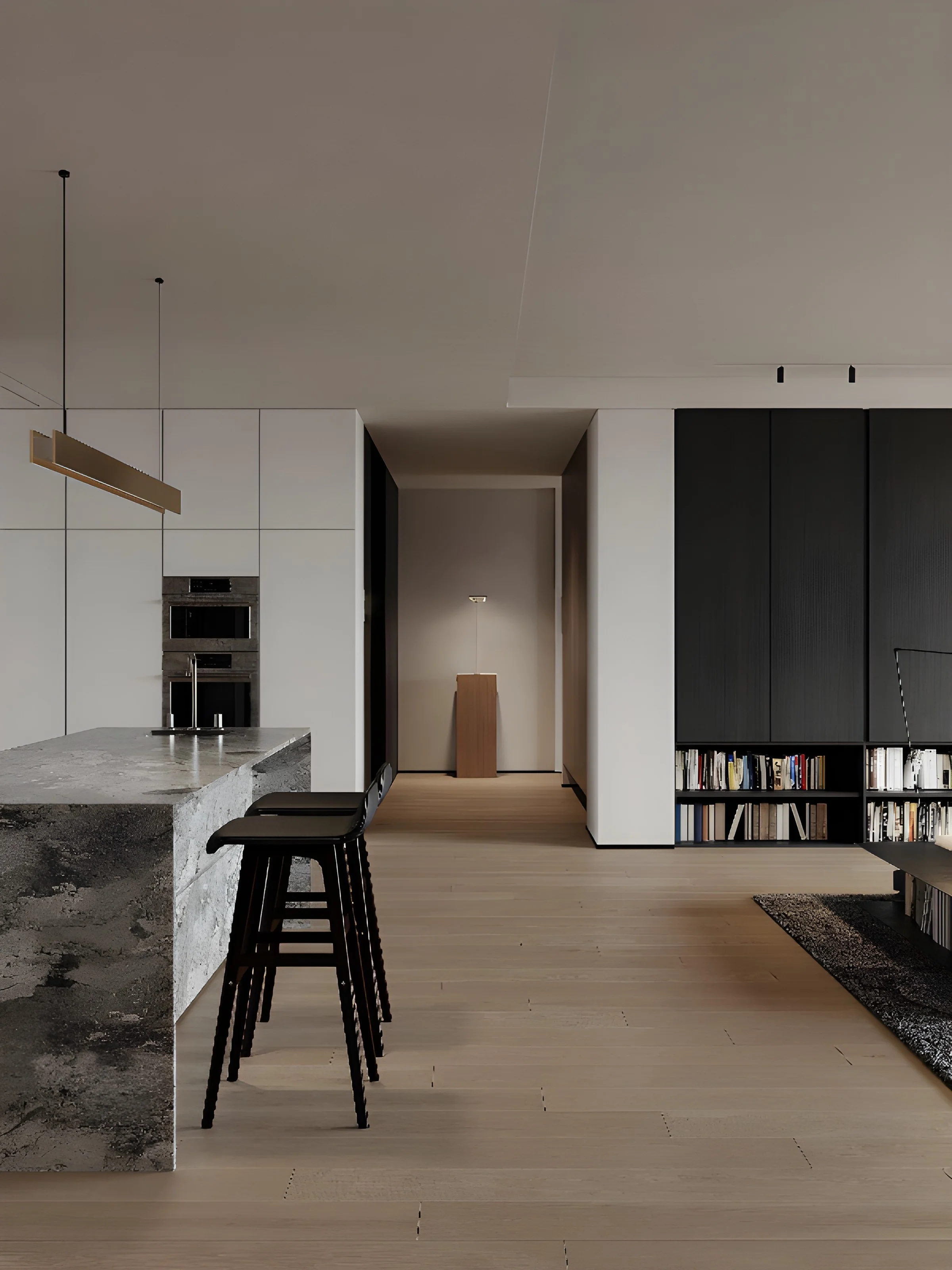 客厅:黑白灰的经典配色,永远不会出错!白色的沙发像云朵一样柔软,黑色的柜体稳重又大气。超大的落地窗,把窗外的景色框成一幅画,白天阳光洒进来,整个空间亮堂堂的。搭配上灰色的地毯,脚感超舒服,坐在这喝杯咖啡、看看书,别提多惬意!