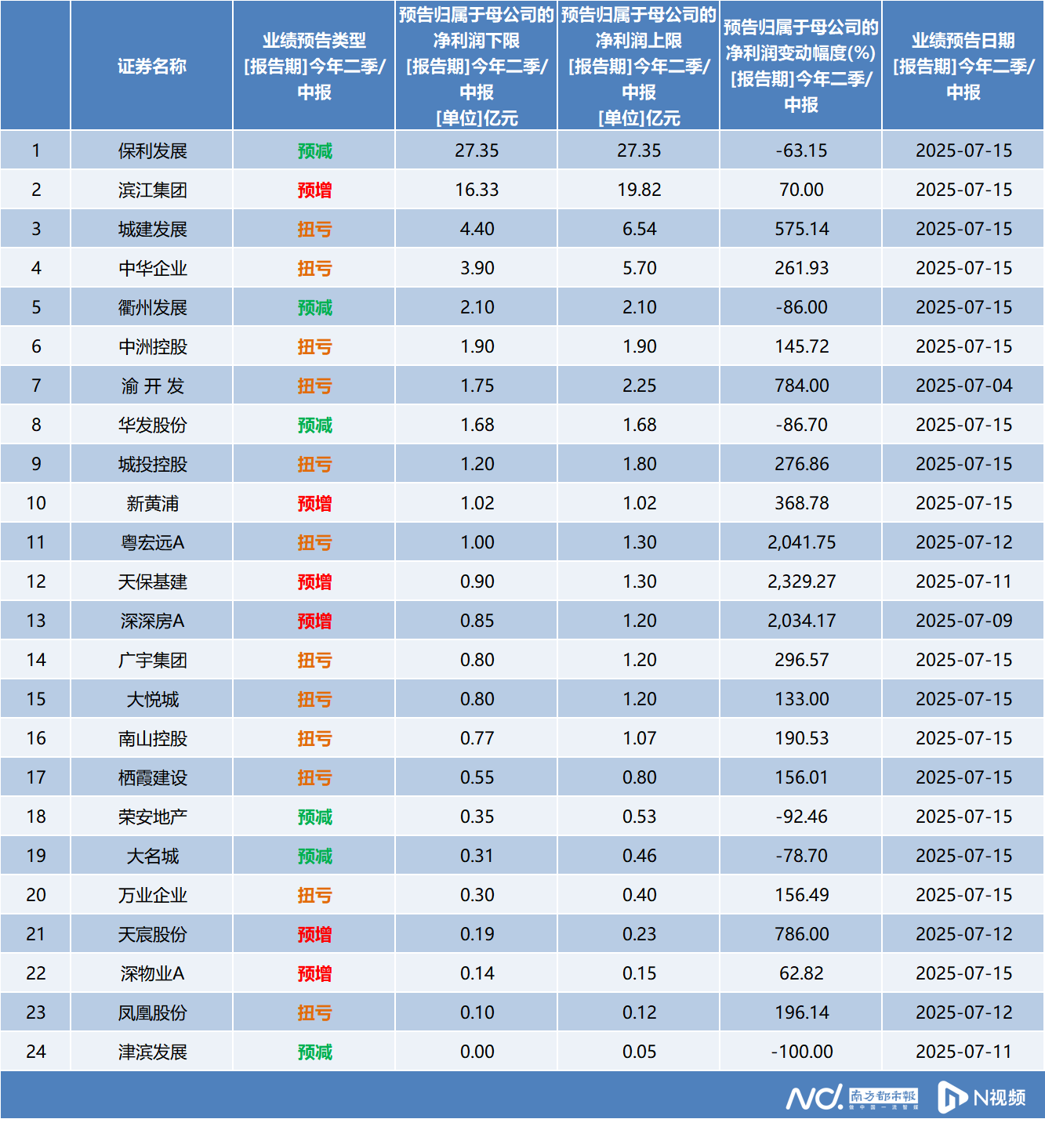 尽管2025年上半年众多房企面临亏损或业绩下滑的困境,但值得一提的是,一些企业通过积极应对策略,已悄然开启局势的逆转。南都·湾财社记者梳理发现,2025年上半年有24家房企实现盈利,累计盈利68.68亿元至80.16亿元。其中6家企业预计录得净利润增长,12家企业实现了扭亏为盈,包括城建发展、中洲控股、城投控股、大悦城、南山控股等房企。