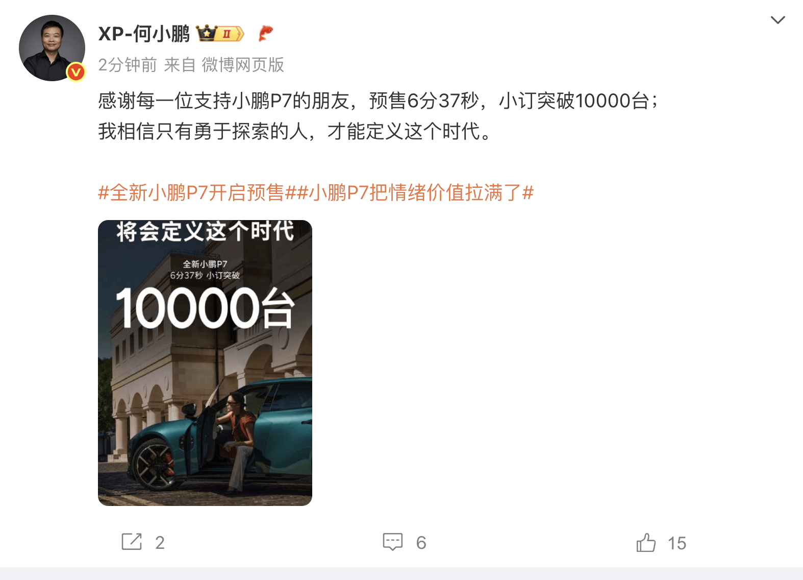 何小鹏:全新小鹏P7预售6分37秒小订突破10000台