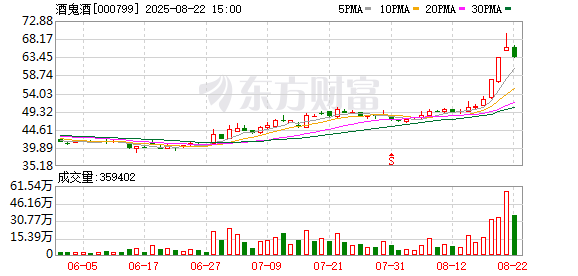 不过,尽管业绩承压,但酒鬼酒股价在二级市场上,近期却是表现强劲,8月以来,酒鬼酒股价自47.02元上涨至8月22日的63.34元,其中在8月19日、20日连续两天涨停。