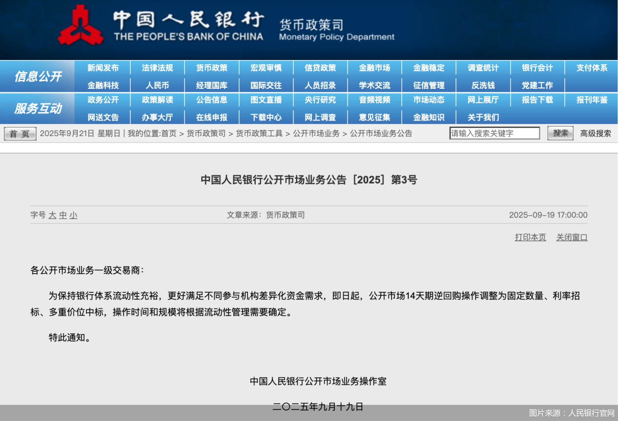 北京商报讯(记者廖蒙)国庆假期临近,公开市场工具再迎调整。就在9月19日,中国人民银行发布公开市场业务2025年第3号公告指出,为保持银行体系流动性充裕,更好满足不同参与机构差异化资金需求,即日起,公开市场14天期逆回购操作调整为固定数量、利率招标、多重价位中标,操作时间和规模将根据流动性管理需要确定。