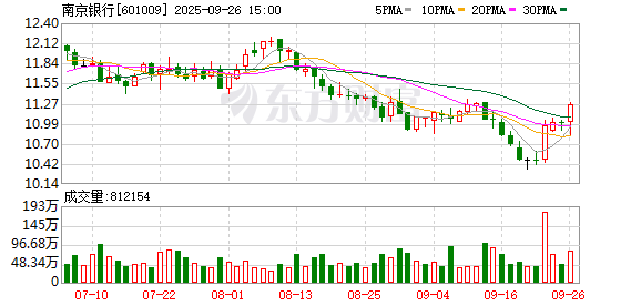 Wind数据显示,7月19日-9月26日间,南京银行股价大体呈“先上升,后下降,再回弹”的趋势。7月21日-8月8日,南京银行股价总体呈现上涨趋势,8月8日当天一度上涨至12.2元/股,创下新高。此后,南京银行股价总体呈现下跌趋势,9月19日一度跌至10.34元/股,为阶段低点。随后,南京银行股价整体上涨,截至9月26日收盘报11.26元/股,日内上涨2.36%。
