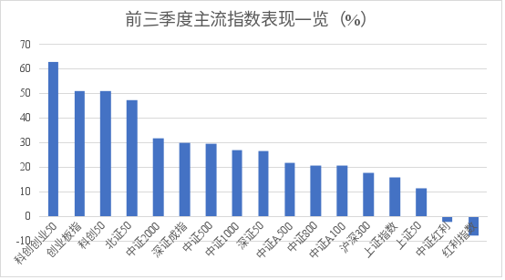 具体来看,主流指数前三季度总体上演上涨行情,其中科创创业50年内涨幅达到63.04%,表现最好;创业板指、科创50、北证50、中证2000等指数表现强势,涨幅超30%,仅红利指数、中证红利出现下跌。