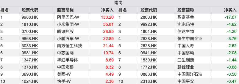 大幅净买入:阿里巴巴-W(09988.HK)133.20亿港元;小米集团-W(01810.HK)55.81亿港元;腾讯控股(0700.HK)28.95亿港元;小鹏汽车-W(09868.HK)22.85亿港元。